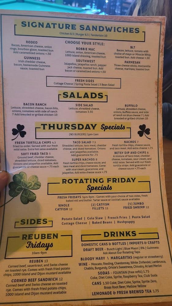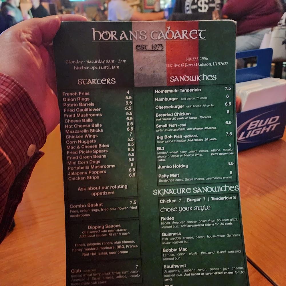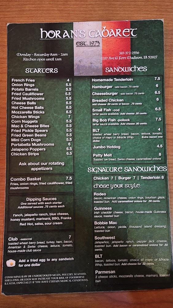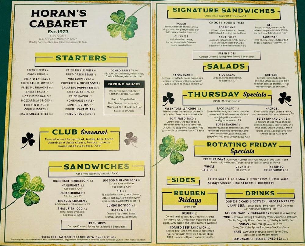 Cabaret's menu celebrates classic American and Irish dishes with a twist. Popular selections include the Homemade Tenderloin and the hearty fried dishes like onion rings, fries, and fried cauliflower, all made for sharing. Their specialties such as Soft Shell Tacos and various sandwiches are a must-try, each crafted with care.